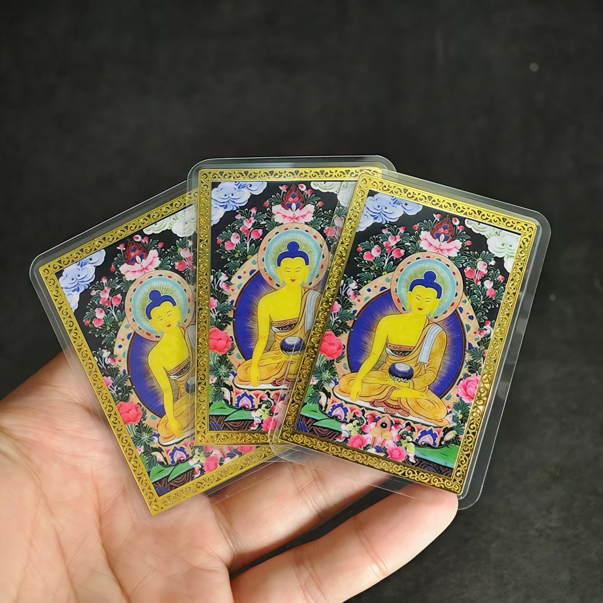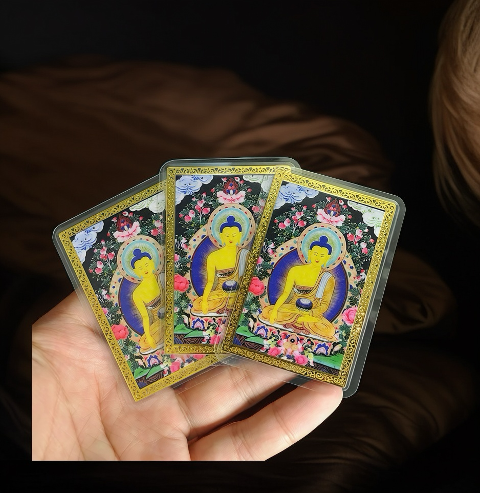 This intricately designed Shakyamuni Buddha amulet features a beautifully painted image of the Buddha, set on a gold-plated copper card, and encased in a protective plastic layer. Available in multiple styles, each piece is a spiritual talisman meant to invoke blessings and offer protection to the wearer.